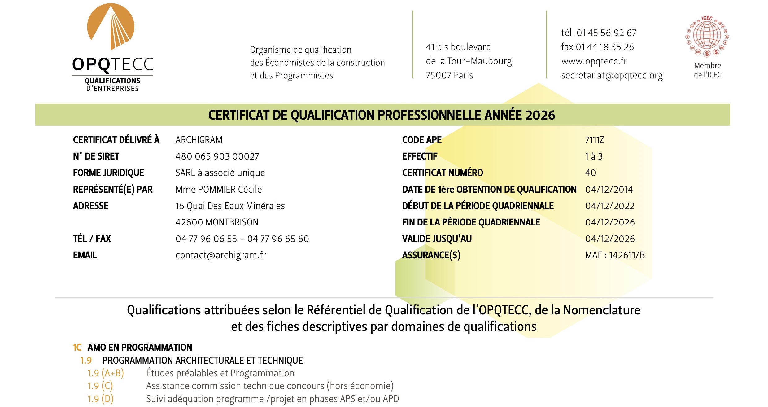 - Intervient sur les dossiers traités par ARCHIGRAM sur les phases de mise en place des maîtres d’œuvre et le suivi de conception (APD, PRO-DCE)